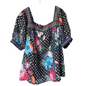 JOHNNY WAS Polkalona Square Puff Sleeve Neck Park Embroidered Blouse Size XL