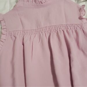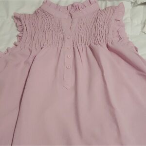 Frilled sleevless blouse. Pink top with buttons and pleats. Flowy fit. Size L. Measures approximately: Bust 41.3โ, shoulder 13.9โ, length 28โ. EUC.
