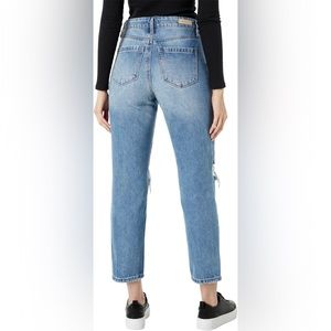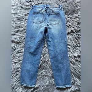 High-rise fit jeans with four-button fly closure and traditional five-pocket construction.
