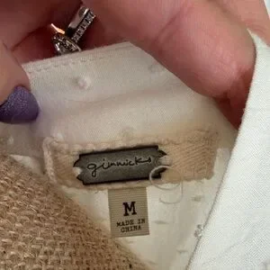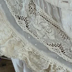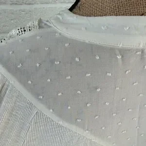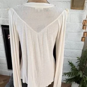 Chic cream blouse with intricate lace detailing. Button-up front. Perfect for versatile styling.