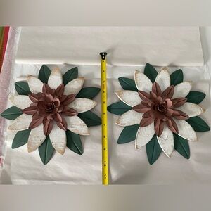 Beautiful floral wall decor featuring distressed wood and metal petals. Perfect for adding a touch of color and charm to any room. Price includes both flowers.