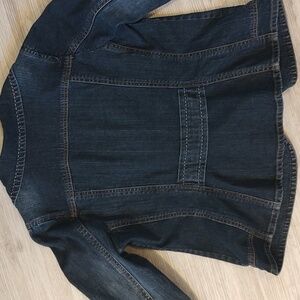 Like new condition VENEZIA denim jacket size 14/16. Dress up or down your outfit with this understated gem with impeccable detail and two-button quarter length sleeves. The back belt will give you a slightly fitted look. The fabric has been bleached to create the pocket design topped with decorative stitching. Pit to pit 21", sleeve 19", shoulder to hem 23".