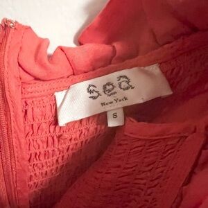 Sea NY Frida coral red smocked ruffle rosette off shoulder midi dress cotton