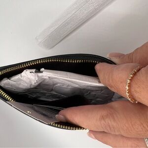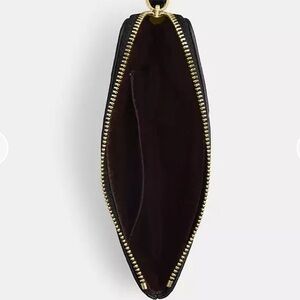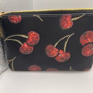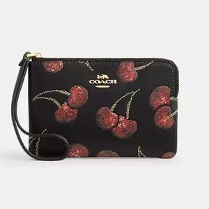 Elegant Coach wristlet with floral design. Black base with red accents. Gold logo detail. Perfect for any occasion.