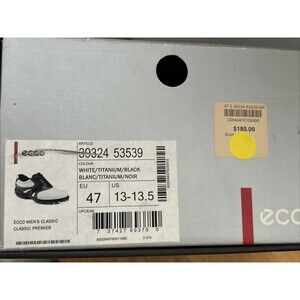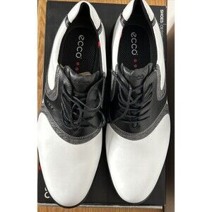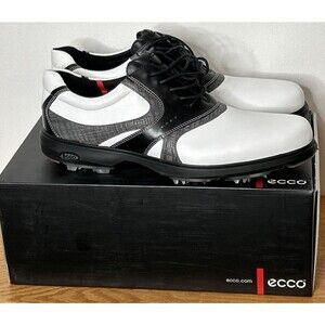 The product is a new pair of Ecco Men's Classic Premiere Golf Shoes in a size 13-13.5, featuring a stylish design in white and black. These athletic shoes are specifically designed for golf performance, ensuring comfort and stability on the course. With the reputable brand ECCO known for quality and style, these golf shoes are a great choice for any golfer looking to elevate their game.