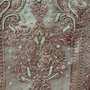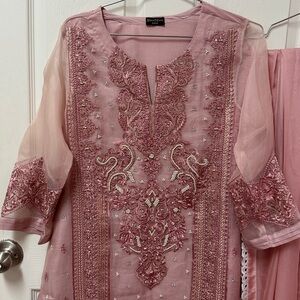 Beautiful pink dress with intricate embroidery. Includes matching dupatta and white pants. Perfect for special occasions.