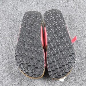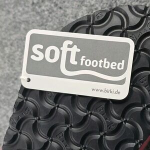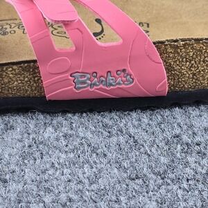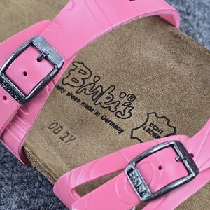 Birki's Moorea Soft footbed sandals in bright pink/coral with dual buckle straps and cork footbed, new in box. Marked EU 40 which converts to women's 9–9.5 US. Soft latex-cushioned footbed, Birko-Flor uppers, EVA sole, and leather footbed liner. Made in Germany Birki's line by Birkenstock. New with original box and tags; only a couple very faint storage marks on the straps as shown in photos. Clean unworn soles. See photos for details.