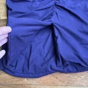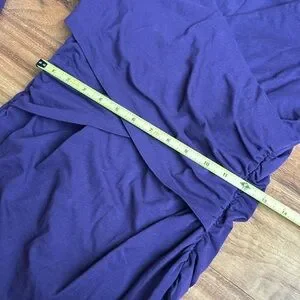 Beautiful purple cotton/spandex dress. V-neck with flattering ruching on the front and back. Very comfortable and flattering fit.