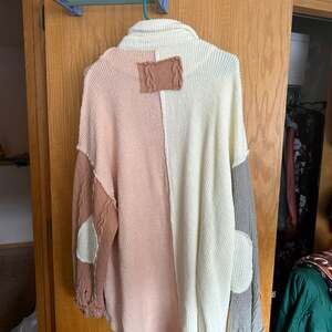 POL Color Block Mixed Media Button Down Cardigan in Ivory, Salmon, and Grey Multi. This eye-catching cardigan features a unique combination of textures including cable knit and ribbed patterns. It is designed with an oversized, relaxed fit, a classic collar, and large functional buttons down the front.
