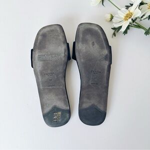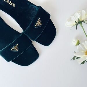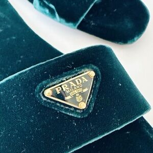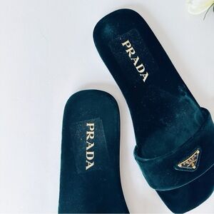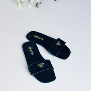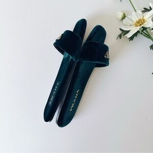Prada Triangle Logo Dark Green Velvet Slide Sandals