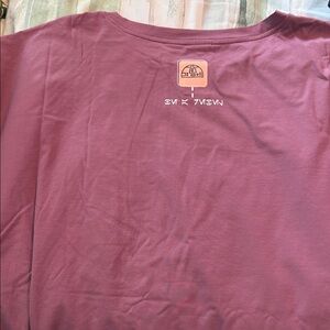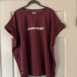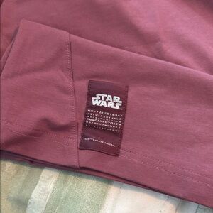 Plum crewneck tee with Star Wars logo. Soft fabric. Casual wear.