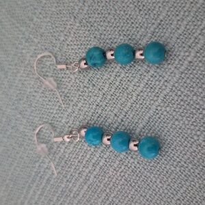 16 1 1/2" Choker, 8mm Shell Rings,Natural Turquoise Beads 6mm. Turtle Motif.Matching 7" Braclet,Turquoise 6mm beads in 1 1/2" Earrings. Necklace strung on Stainless steel jewelry wire. All closures are Stainless steel non tarnish. Earrings are Sterling Silver. Braclet is strung on heavy duty jewelry cord.