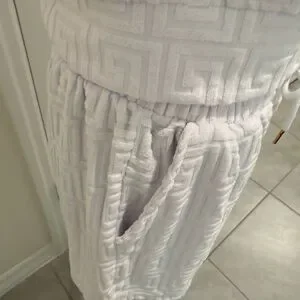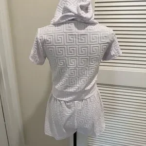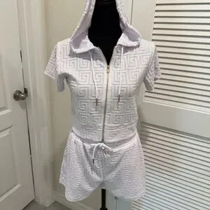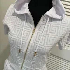 Stylish white hooded short set featuring a textured pattern and gold zipper accents. Perfect for casual outings.