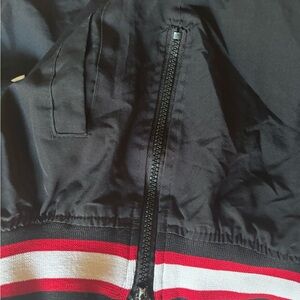 Stylish black pullover by STARTER. Features bold red and white stripes. Official NBA product. Only sign of wear is on the zipper, small amount of paint chipped. The jacket itself has no signs of wear