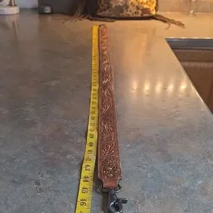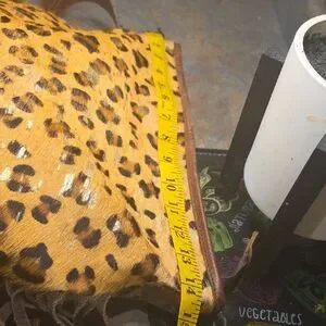 Leopard print with rich brown accents. Features long fringe and embossed strap. Bold and stylish design.