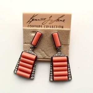 KJL coral and silver deco earrings with crystal detailing around the edges.