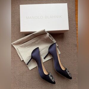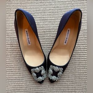 Hangisi 70 navy heels by Manolo Blahnik. Features square buckle encased in a gunmetal frame, with stiletto mid heal (70mm). Only worn one time. In great/excellent condition. The only wear noticeable is the bottom of the shoe. Size 38. Made in Italy. Original box and 2 gray dust bags included.
