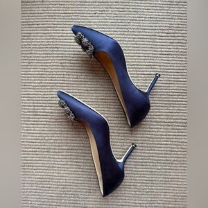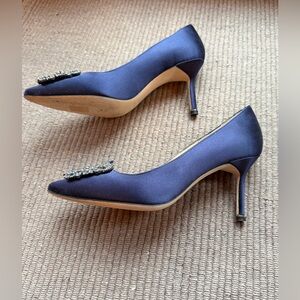 Manolo Blahnik Hangisi Navy Blue Satin 70mm heels.