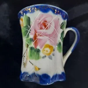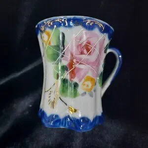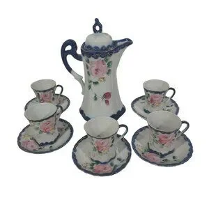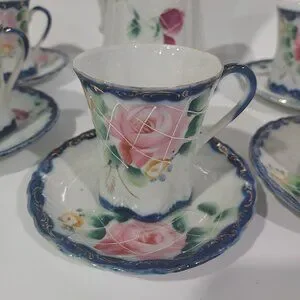 Hand painted. This is amazing when you see it in your hand how the artistizen hand painted it. The cobalt blue color, the roses the detailed gold on each of the 5 cups and the 5 saucers. The actual star of the group is the 9 inches tall chocolate pot with the decorative lid and handle make this a piece of art work.