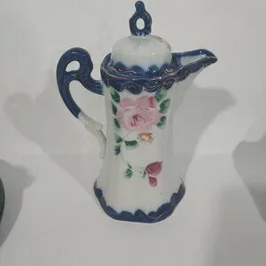 Chocolate pot with lid is had painted cobalt blue, gold with roses