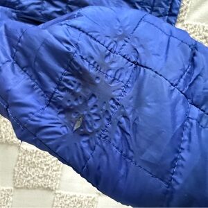 Warm and lightweight puffer. Perfect for outdoor adventures. Price reflects loose threads and hole/stain shown.