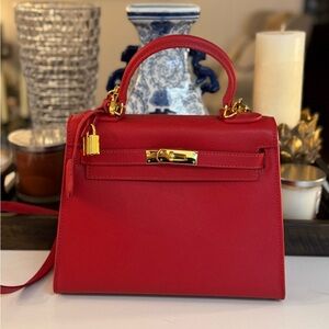 Elevate your style with this luxurious red leather satchel. Perfect for any occasion. Only carried once. Asking price accounts for Posh fees. This bag is beautiful! No flaws except for small mark on the bottom which is not visible when carried.