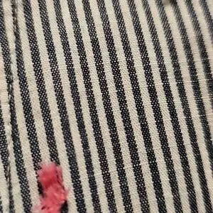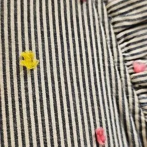 Classic navy and white striped ruffled neck sleeveless dress Cotton and fully-lined, Think spring and summer! Great for the beach or boating. In the evening, pair it with a little pink or yellow sweater to match the "flower" accents on the dress.