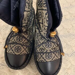 Stylish Tory Burch winter boots. Features black and gold accents. Perfect for cold weather.