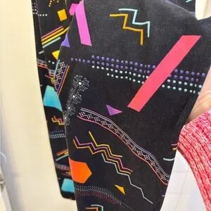 Hello, love! These wild pattern leggings feature a bold abstract pattern in black and pink, perfect for adding flair to any outfit. The feel is like a wonderfully soft, worn in tshirt. Polyester blend. Xox