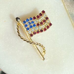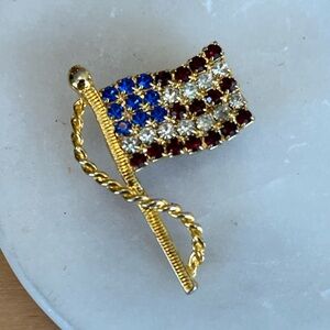 Show your patriotic spirit with this stunning gold brooch featuring red, white, and blue rhinestones. Perfect for any occasion.