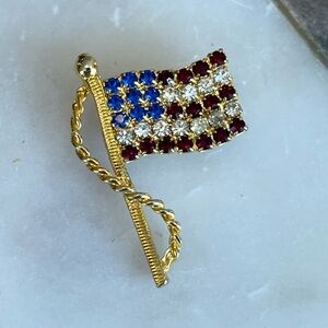 American Flag Brooch Gold Tone with Red, White, and Blue Rhinestones