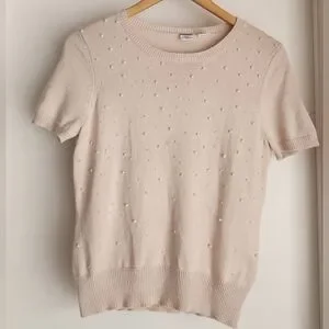 Elegant cream short sleeve sweater featuring delicate embellishments. Perfect for a chic and cozy look.