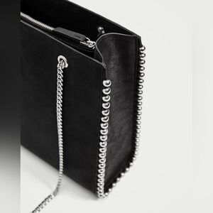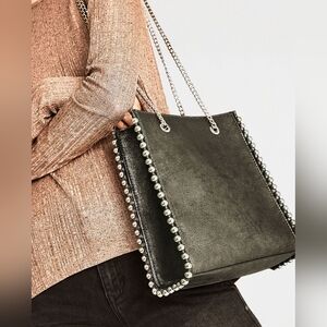 Edgy yet timeless black ZARA tote featuring polished silver stud trim along the sides and base, paired with chunky silver chain shoulder straps. Structured silhouette with a clean, modern look — perfect for elevating everyday outfits.