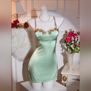 Light green satin slip dress with delicate floral embroidered straps. Features a fitted silhouette and delicate straps. Adjustable spaghetti straps and a zippered back closure. Shiny satin material