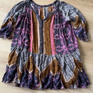 Free People Portobello Road cold shoulder trapeze mini dress. Three-quarter, full sleeves. Full, gathered skirt. Notched V-neck with hidden button placket. Loose pullover styling Can be worn as a short dress or long tunic