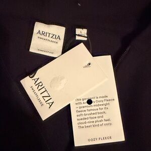 Aritzia sweatfleece zip front hoodie. Perfect fit size L. Kangaroo pockets. Ribbed hem and cuffs. New with tags, no issues to note. Pls see pics for tags and measurements.
