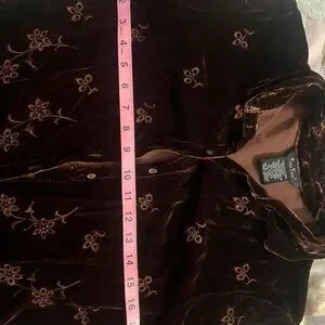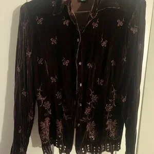 Luxurious velvet shirt with floral embroidery. Button-down style. Perfect for casual elegance.Rayon and silk fabric for extra luxurious feeling. Great condition.