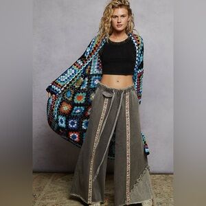 Wrap yourself in vintage-inspired charm with this stunning POL Boho Crochet Duster Cardigan. Featuring a bold turquoise and black granny square pattern, this longline sweater is a cozy statement piece that blends retro soul with modern bohemian flair.