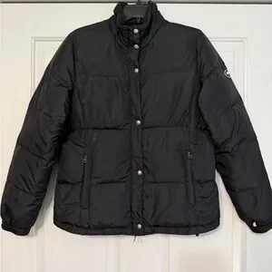 Stylish black puffer jacket. Features a sleek design. Perfect for cold weather.
