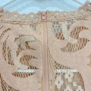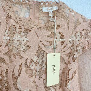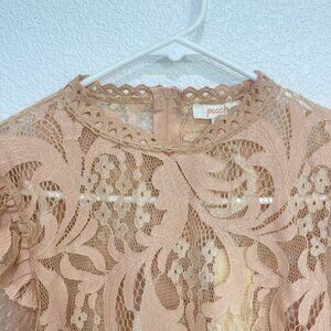 Bohemian elegance meets modern romance. This stunning Peach brand blouse features an intricate floral lace overlay and statement puff sleeves. The neutral nude/tan tone makes it incredibly versatile for styling.