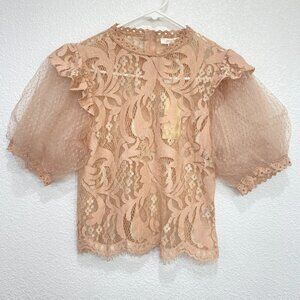 Peach Nude Floral Lace Puff Sleeve Blouse Mock Neck NWT Medium