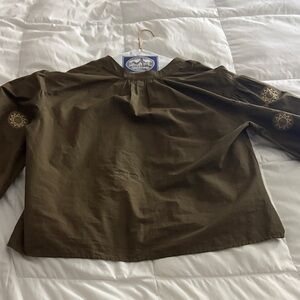 Stylish olive blouse with intricate gold accents. Features a drawstring neckline with tassels. Perfect for casual wear.