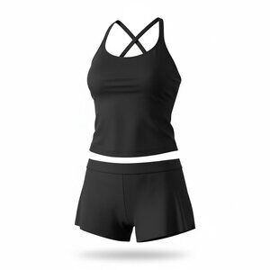 Athleta black two-piece swimsuit featuring a fitted tankini-style top with supportive, strappy back detail and matching swim shorts. Sleek, flattering, and comfortable with Athleta’s high-quality performance swim fabric.