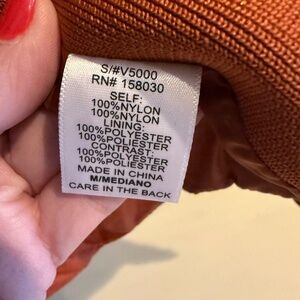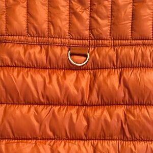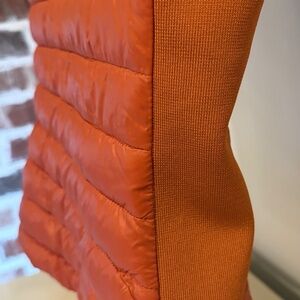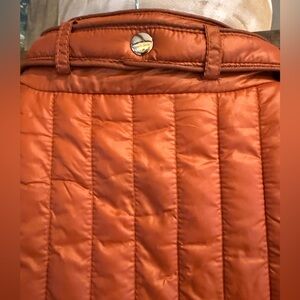 This rust orange quilted puffer vest is from the brand Love Tree in a size Medium. It is a women's lightweight vest, featuring a stand-up collar with snap buttons, gold hardware, functional front pockets with snap closures, and stretchy side panels for a fitted silhouette.