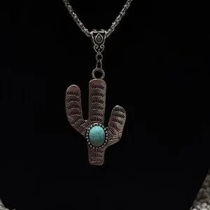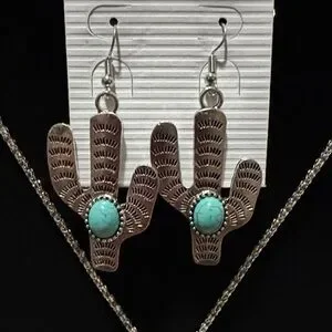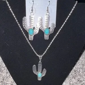 Embrace the spirit of the desert with this stunning silver and turquoise cactus jewelry set. Perfect for adding a touch of elegance to any outfit. Please Note: Multiple sets are available. Each piece features a distinctive crackle finish, creating subtle variations that make every set uniquely beautiful. While the set you receive may not be the exact one photographed, it will be nearly identical in style, tone, and overall aesthetic — with its own one-of-a-kind character.
