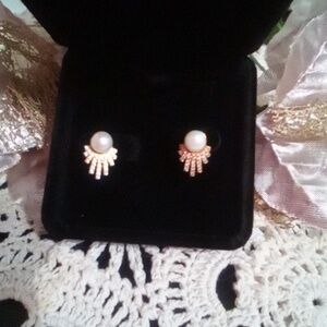These elegant earrings feature a stunning pearl centerpiece surrounded by sparkling design. Perfect for adding a touch of sophistication to any outfit.
