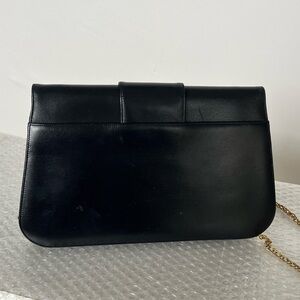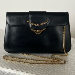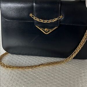 Sleek vintage authentic Cartier dark inky navy leather purse with beautiful gold chain. Perfect for everyday use. Gold chain can be crossbody or doubled up to use as a shoulder bag or tucked inside to use as a clutch.