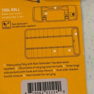 Carhartt 18 Pocket Utility Roll in Carhartt Brown. Durable water repellent, 18 pockets, with hook and loop closure, top handle for easy carrying, unrolled measures : 14” x 4.5”, unrolled 26” x 14”. Comes from a smoke and pet free home. Items shipped out daily! Feel free to ask question I will respond as quickly as possible.