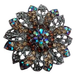Absolutely gorgeous vintage-style floral brooch featuring layered openwork petals adorned with sparkling rhinestones in warm amber, champagne, and deep topaz tones. The center is accented with rich brown stones and vibrant aurora borealis crystals that flash blues, greens, and purples in the light.