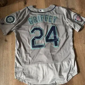 seattle mariners, baseball jersey, sewn patches, hall of fame, team apparel, sports merchandise, gray, statement shirt, official team gear, collector's item